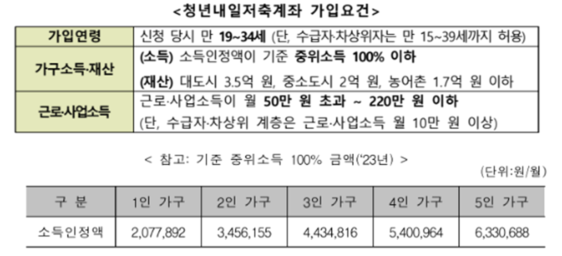 청년내일저축계좌는 만 19~34세 (수급자와 차상위자는 만 15~39세) 중 아래 소득, 재산 요건을 충족할 경우 가입할 수 있습니다.