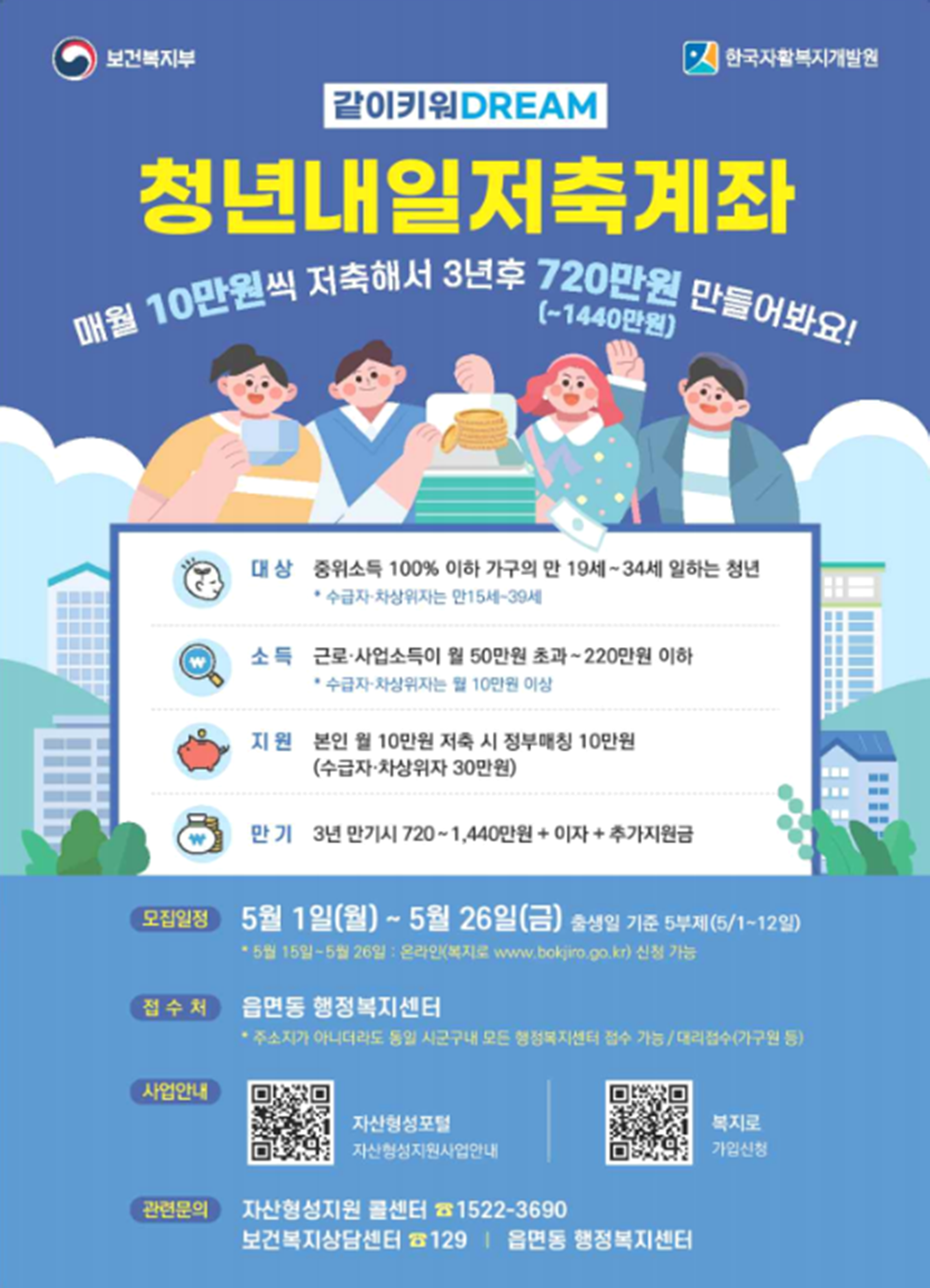 보건복지부에서 일하는 저소득 청년에게 안정적 경제 활동기반을 제공하고, 든든한 사회생활을 지원하기 위한 청년정책 일환으로 시행하는 '청년내일저축계좌'를 5월 1일(월)부터 26일(금)까지 신규 가입자를 모집한다고 해요.