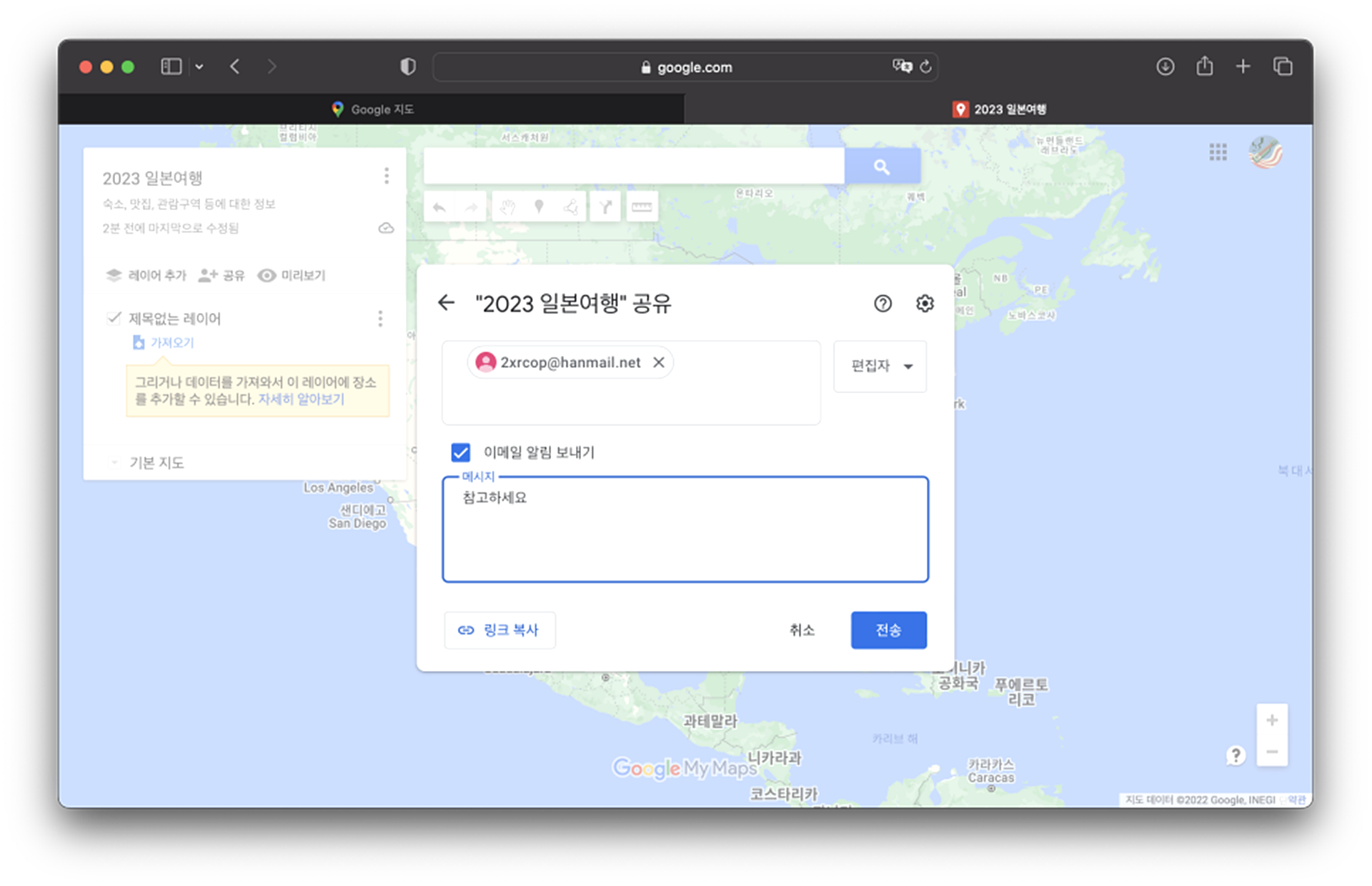 이메일 발송 형식으로 셰어할 수 있고, 링크 복사 형태로도 공유가 가능하죠.