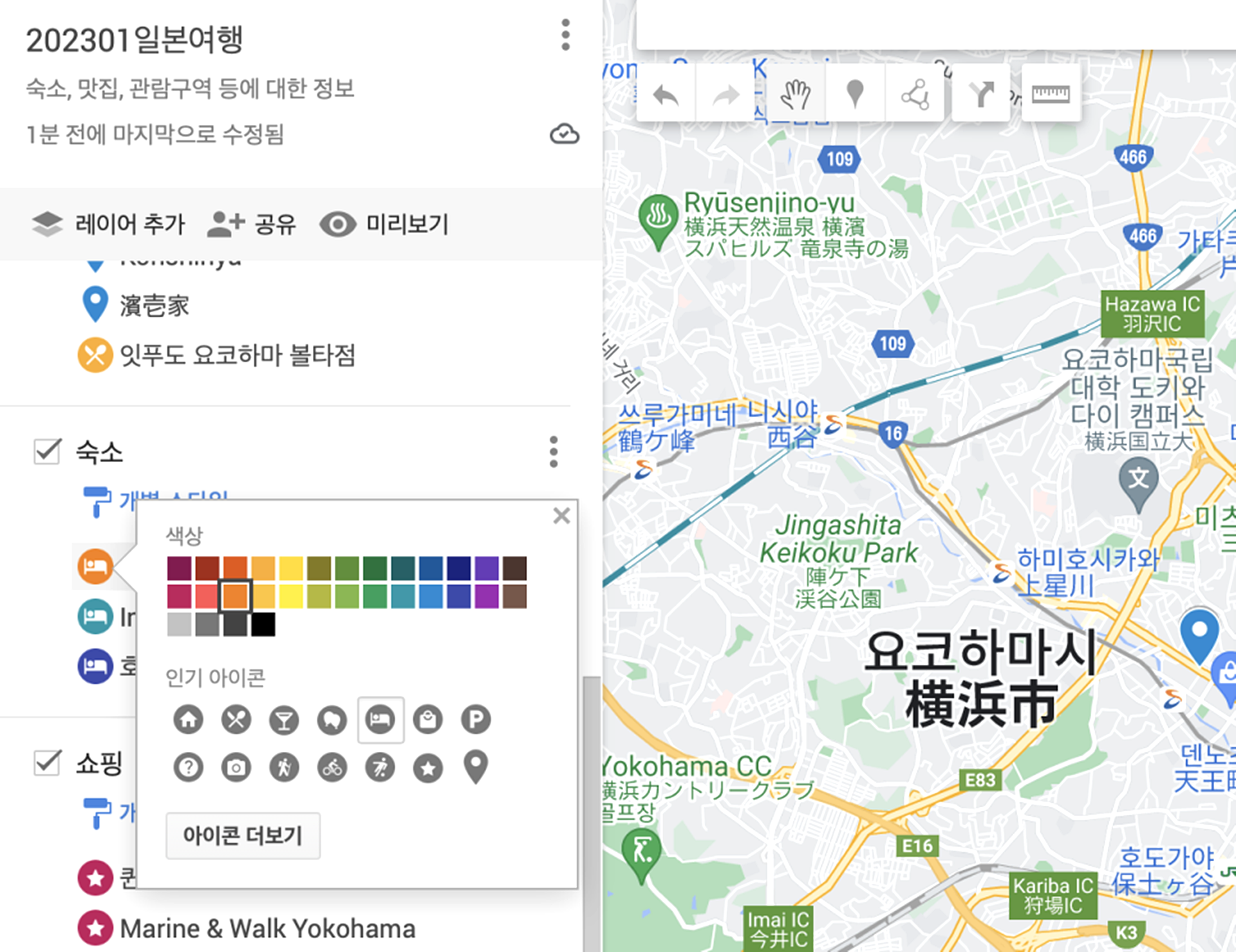 지도 상단에 표시된 팝업창처럼 색상 및 아이콘으로 각 특성에 맞는 것을 선택하여 지정해 주면 맵 상에서 방문하려는 곳의 파악이 좀 더 수월해져요.