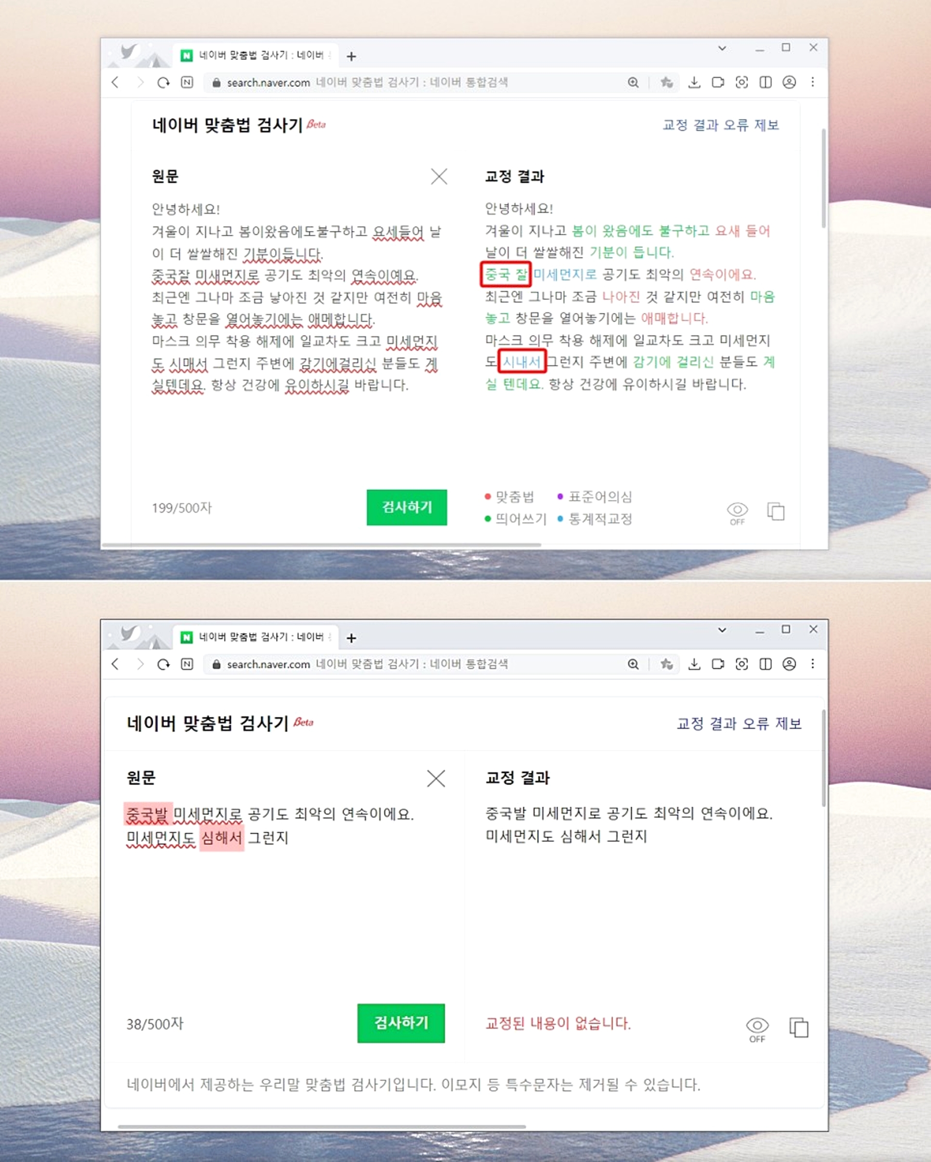 이 외에도 <낳아진 → 나아진>, <에메합니다 → 애매합니다>, <미새먼지 → 미세먼지>도 제대로 적용된 것을 볼 수 있었죠.