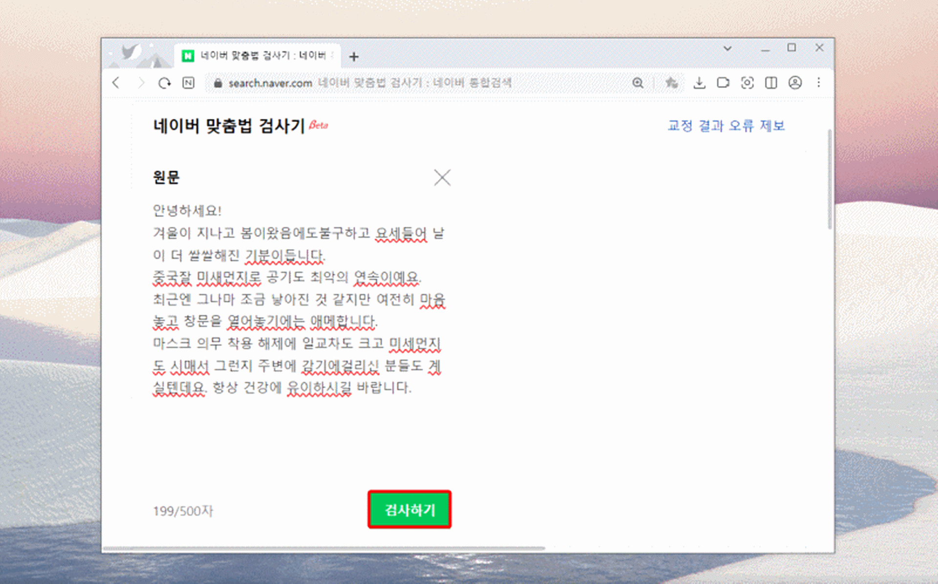 저는 예를 들어 보여드리기 위해 사람들이 많이 헷갈려 하는 단어와 함께 이곳저곳 오타를 적고 버튼을 눌러보았어요.