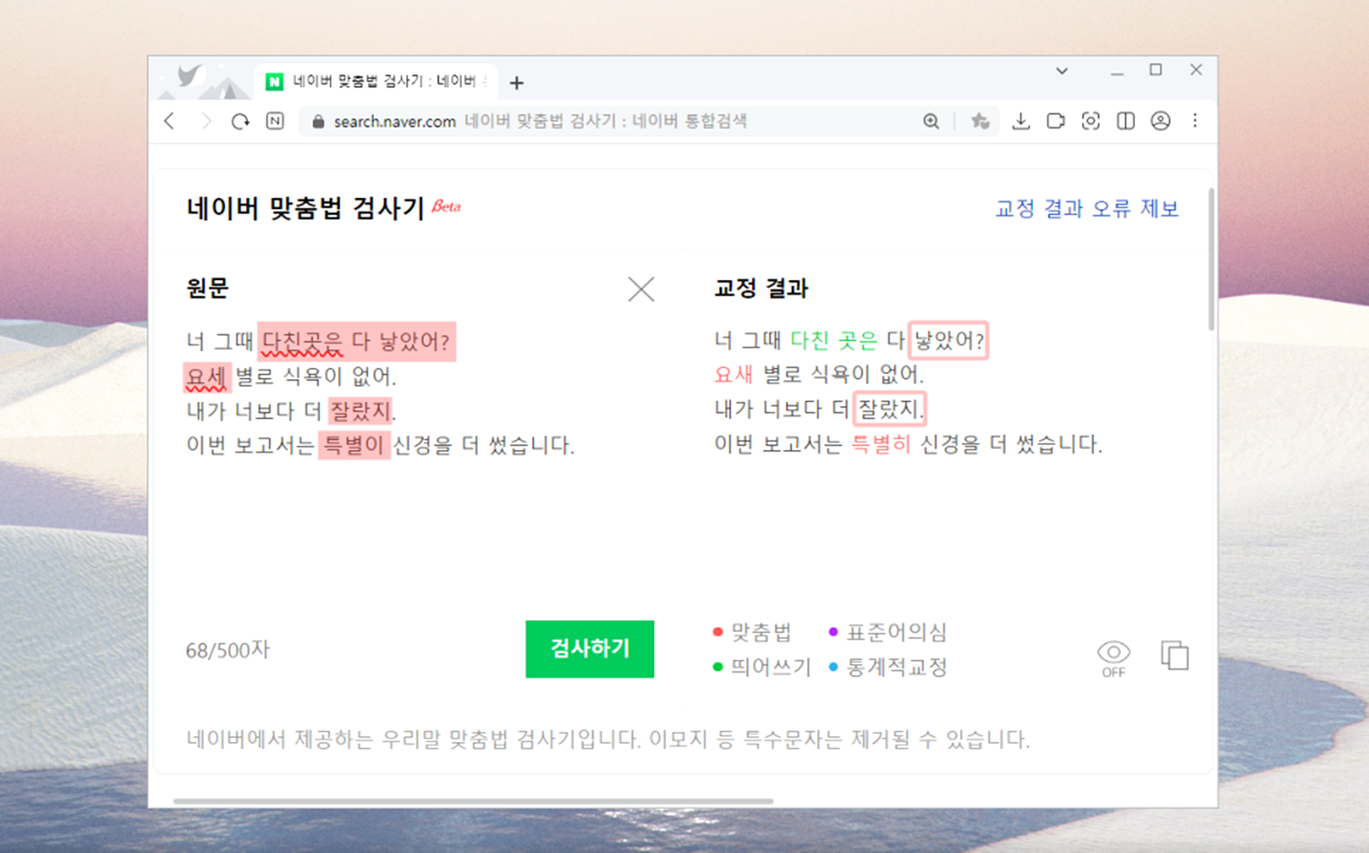 한글 띄어쓰기 검사기답게 띄어쓰기는 물론이고 맞춤법도 교정해줘요.