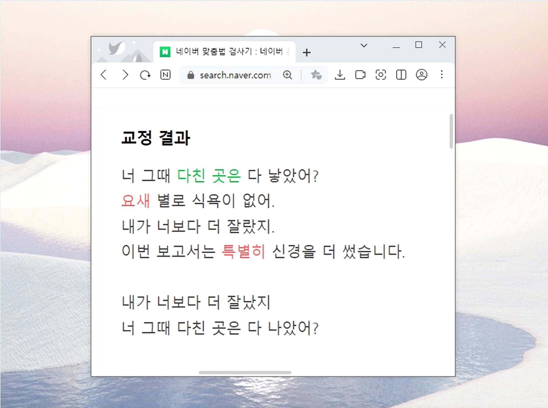 하지만 [나았어 / 낳았어], [잘났지 / 잘랐지] 여기서도 보시다시피 100% 흐름을 읽고 고쳐주는 것은 아니니 유념해주세요.