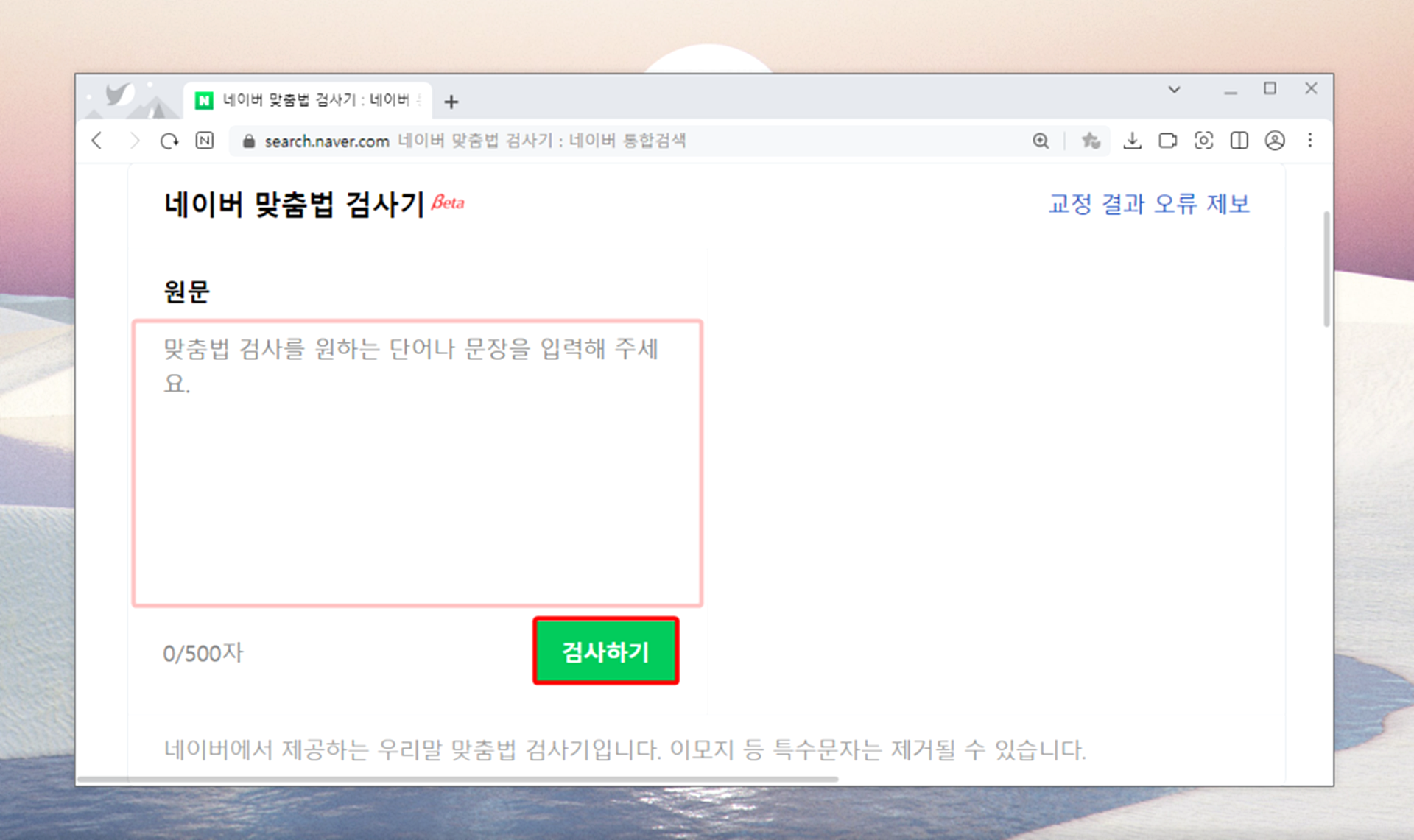 맨 위에 이렇게 심플하게 생긴 화면이 나타나면 원문 아래쪽 빈 공간에 체크하고 싶은 문장을 입력 또는 복붙 후 <검사하기>버튼을 누르세요.
