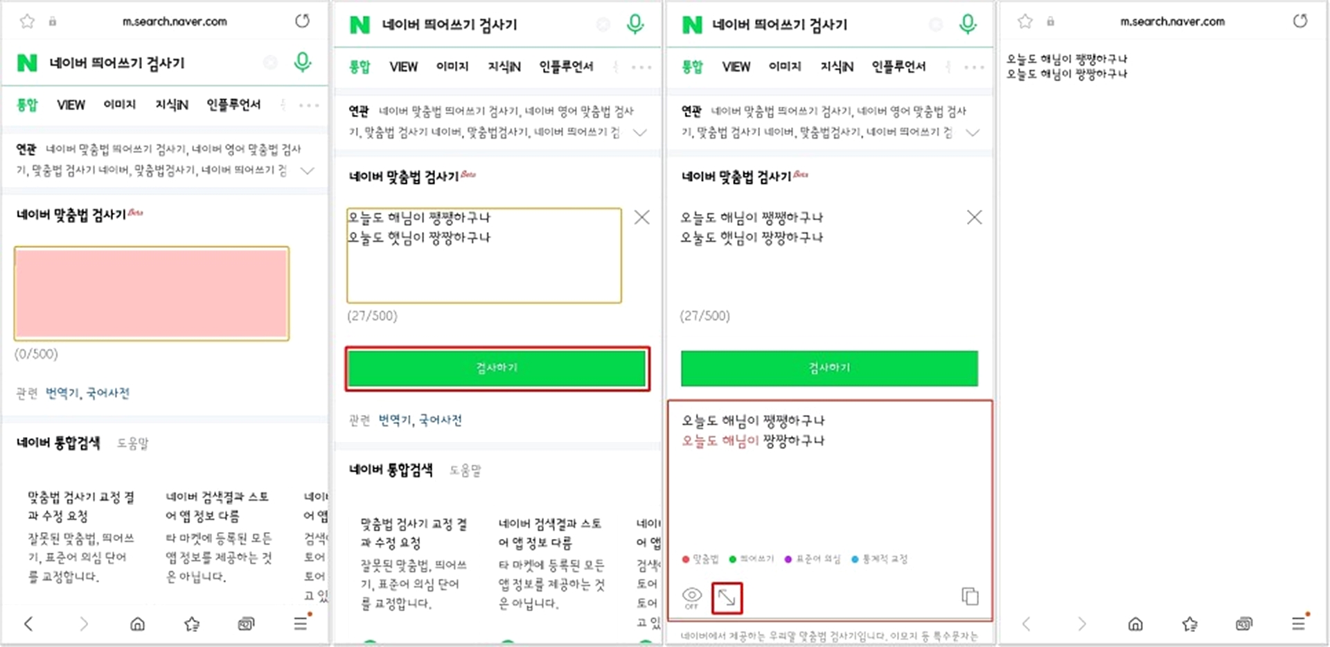 스마트폰에서도 동일한 방식으로 네이버 맞춤법 띄어쓰기 검사기를 사용할 수 있으니 자주 찾게 된다면 즐겨찾기에 추가해놓고 보시는 것도 좋을 것 같아요.