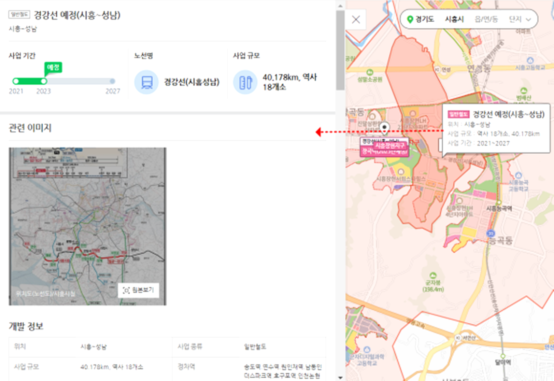 해당 개발사업을 클릭하면 사업기간, 사업명, 개발정보들을 확인할 수 있기 때문에 아주 자세하지는 않더라고 대략적인 개발계획에 대한 정보를 확인할 수 있어요.