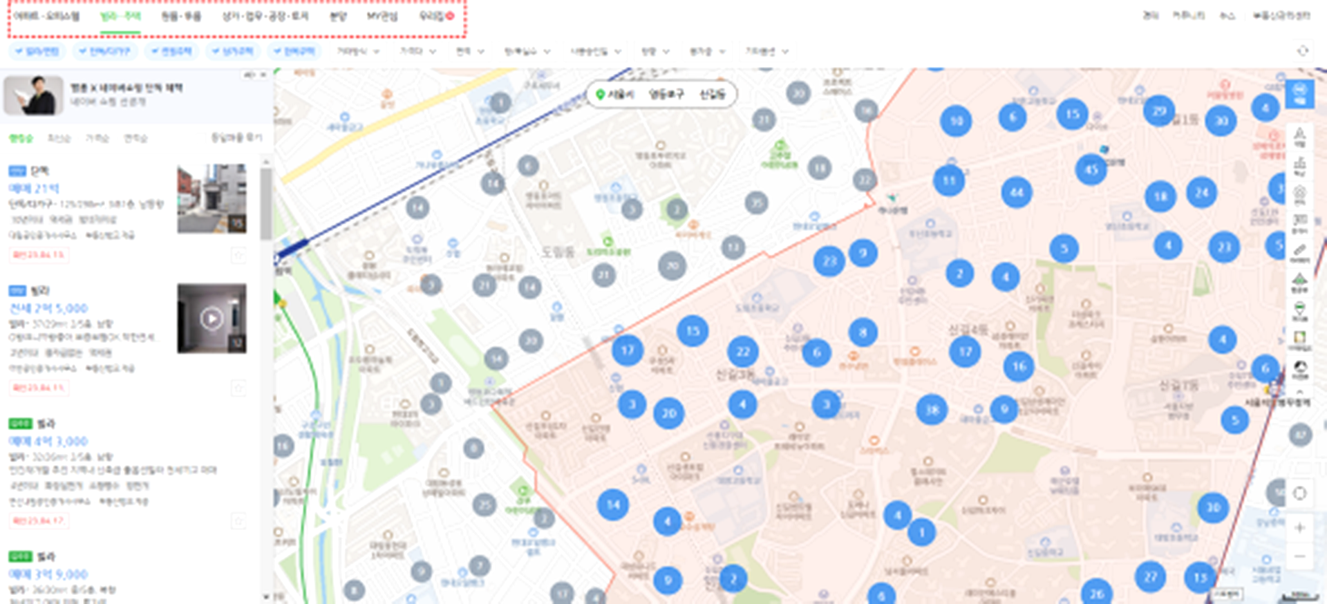 네이버 부동산은 아파트를 기본적으로 보여주기 때문에 들어가면 아파트에 대한 매물이 보여지는데요.