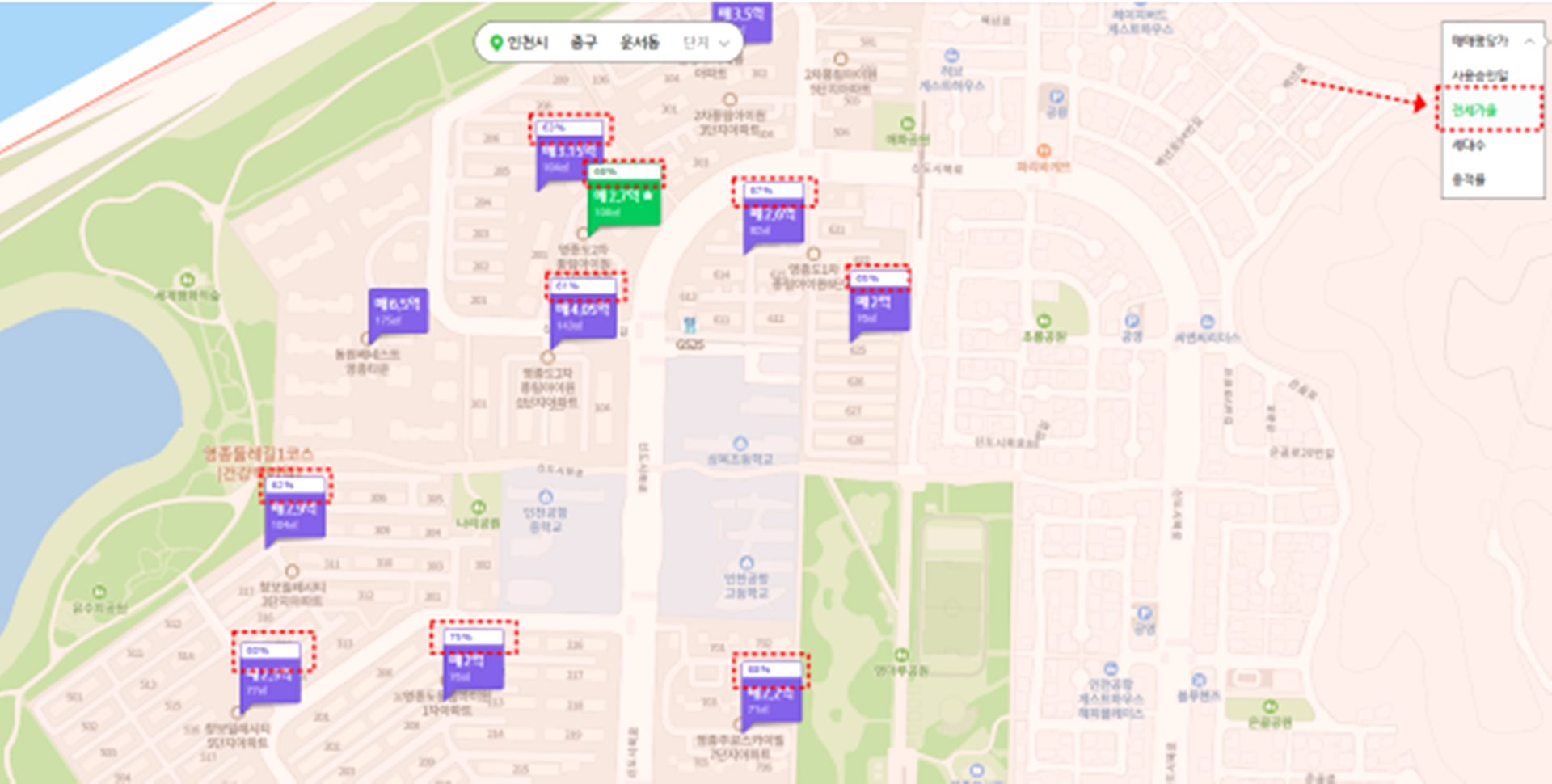 클릭해보면 1)매매평당가, 2)사용승인일, 3)전세가율, 4)세대수, 5)용적률 중 하나를 선택할 수 있죠.