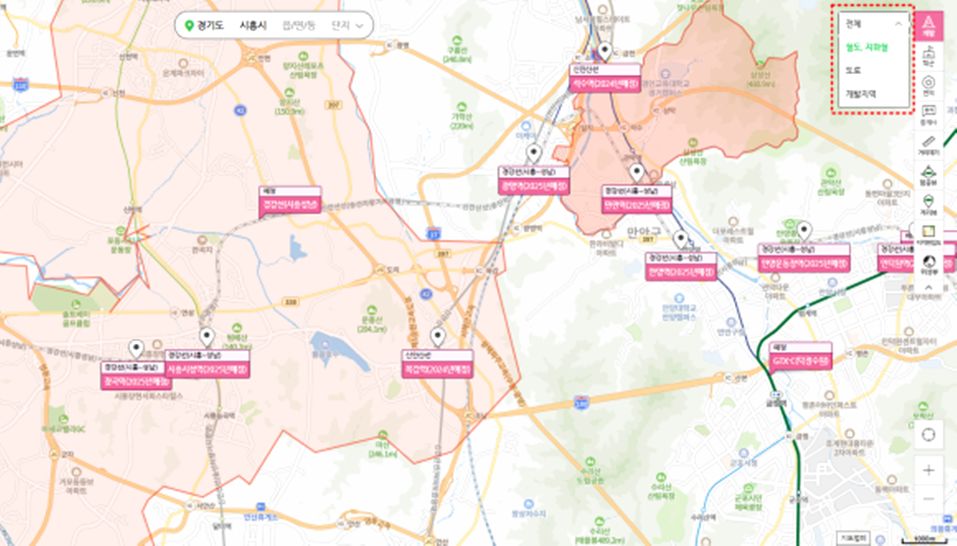 지도 상단 우측에 있는 개발 버튼을 누르면 1)전체, 2)철도, 지하철, 3)도로, 4)개발지역을 선택할 수 있어요.