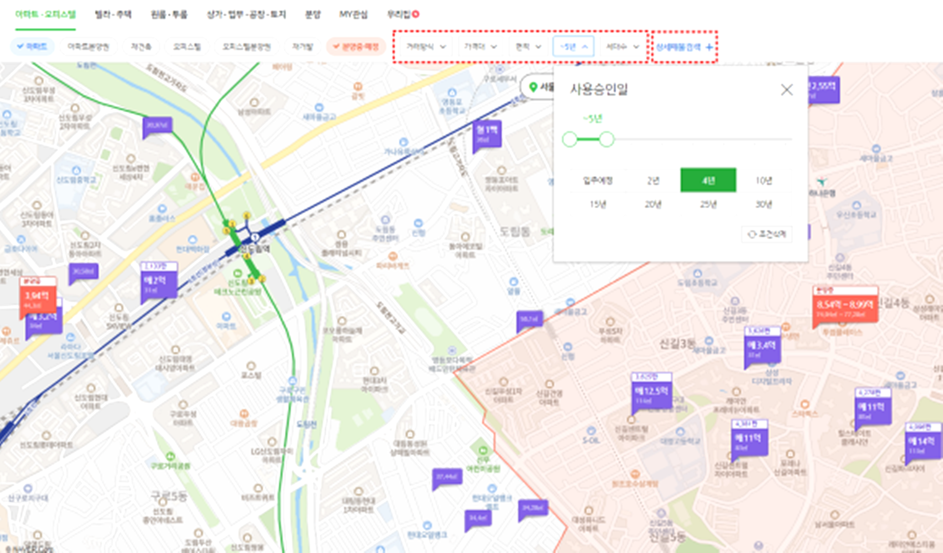 네이버부동산 상단에 보면 "거래방식, 가격대, 면적, 사용승인, 세대수" 등 검색조건을 필터할 수 있는 기능이 있는데요.
