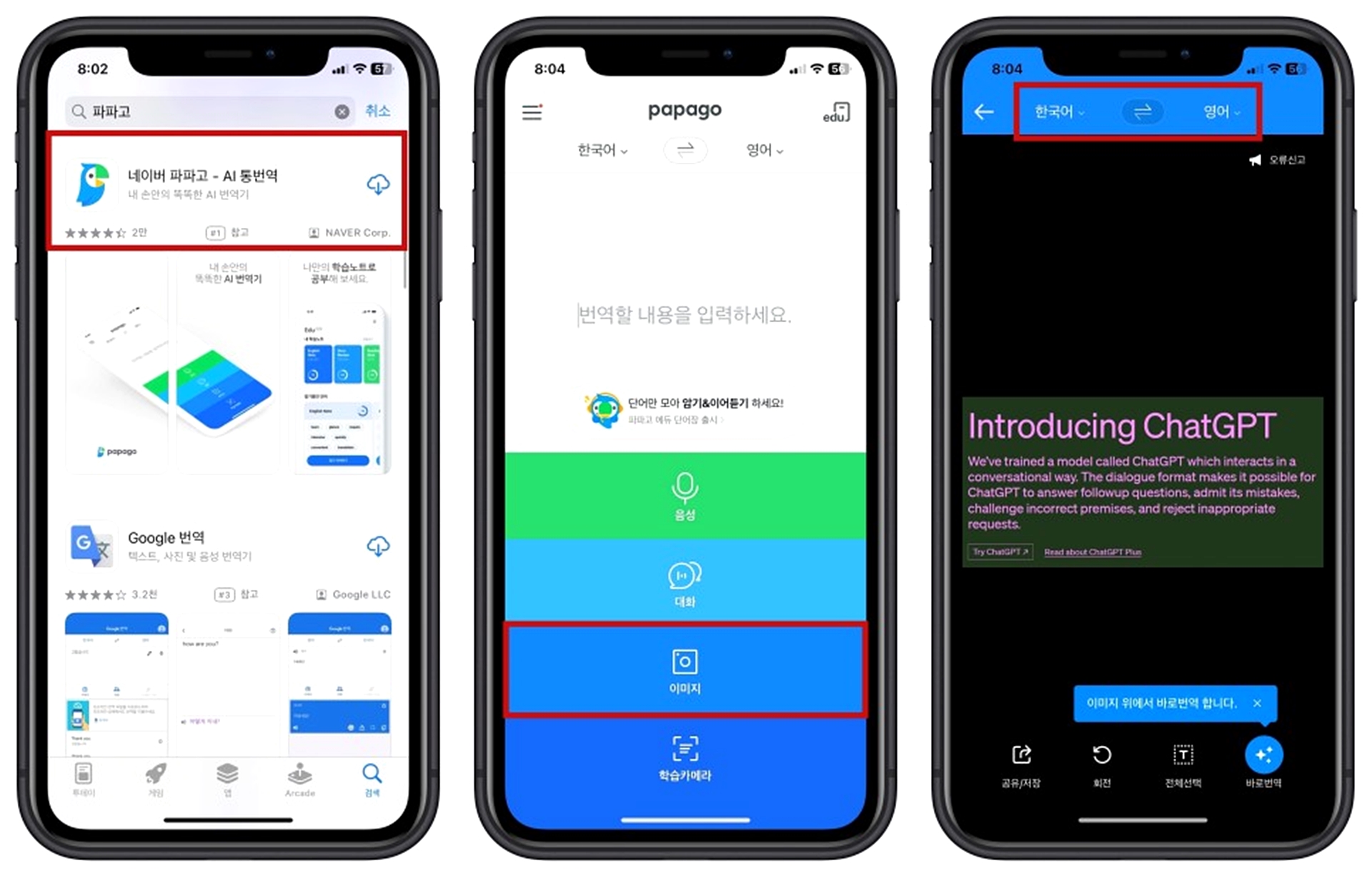 먼저 이미지 번역을 위해 각 스마트폰의 앱스토어 혹은 플레이스토어에서 파파고 앱을 다운로드 및 설치를 진행해주세요.