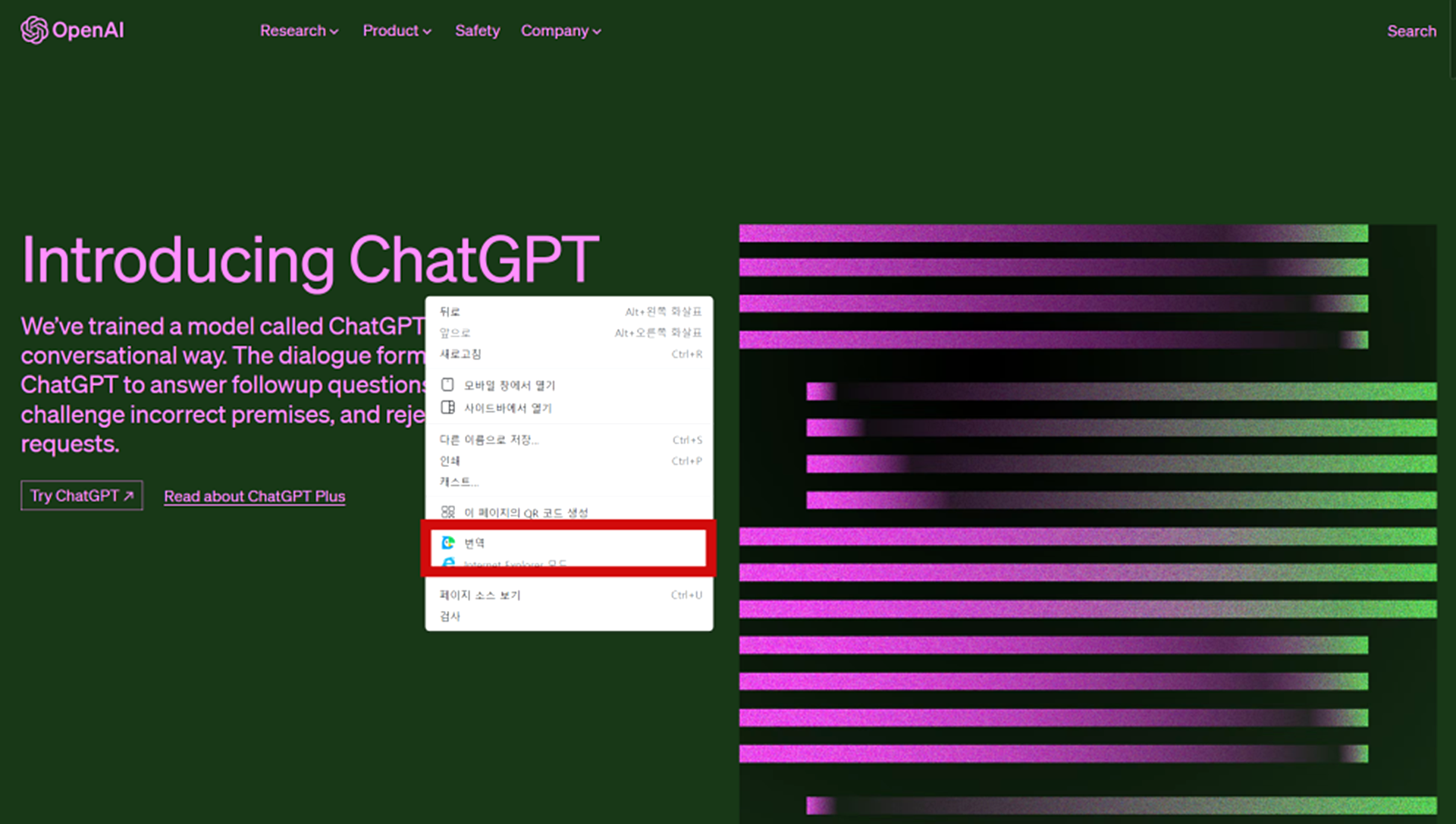 이 외에도 영문 페이지에 접속했다면 ① 웹사이트에서 마우스 우클릭을 한 후 ② 번역을 눌러주시면 간편하게 번역도 할 수 있어요.