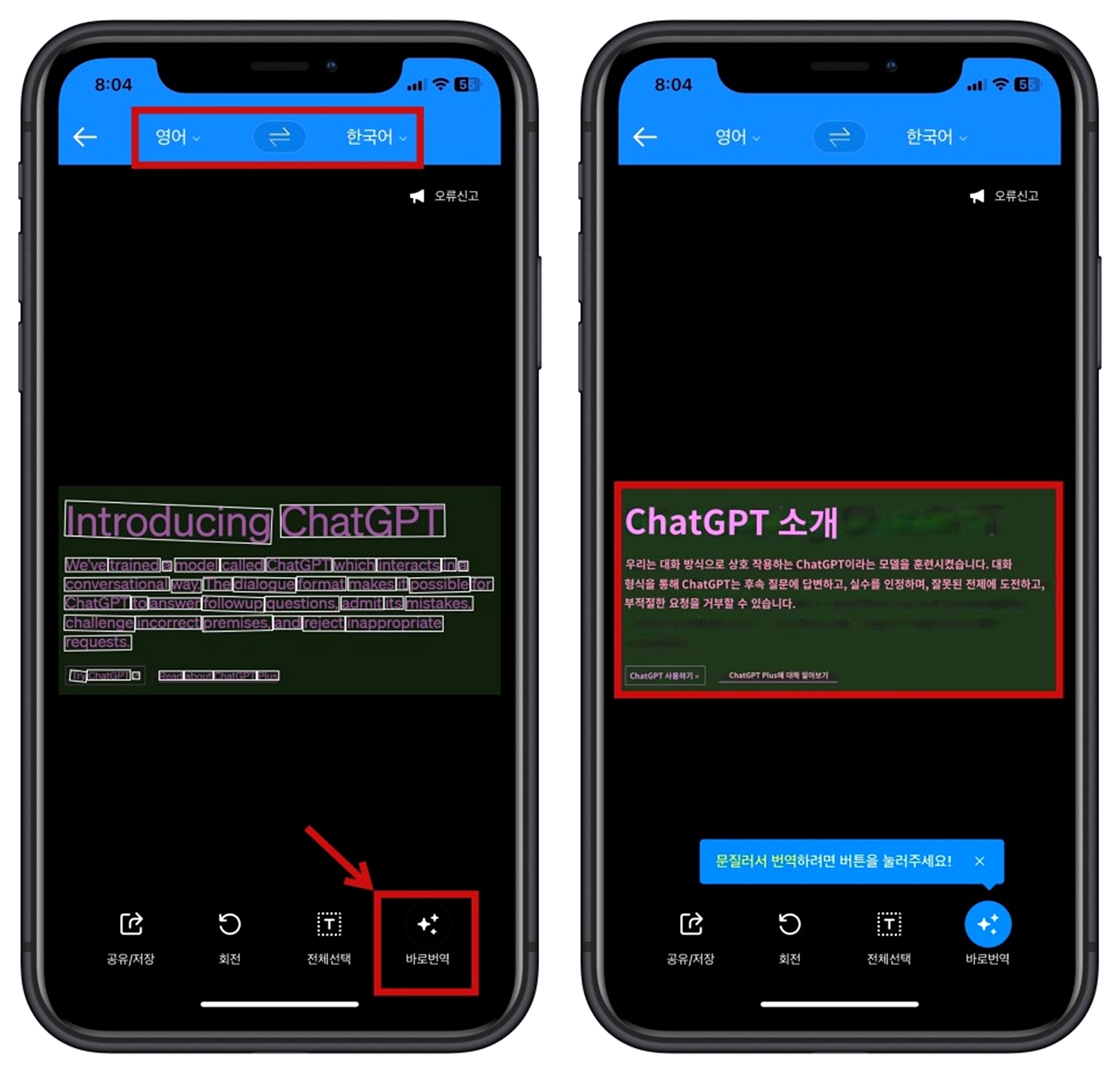 그리고 화면 우측 하단 바로번역 버튼을 눌러주시면 간편하게 이미지를 번역할 수 있죠. 참 쉽죠?^^
