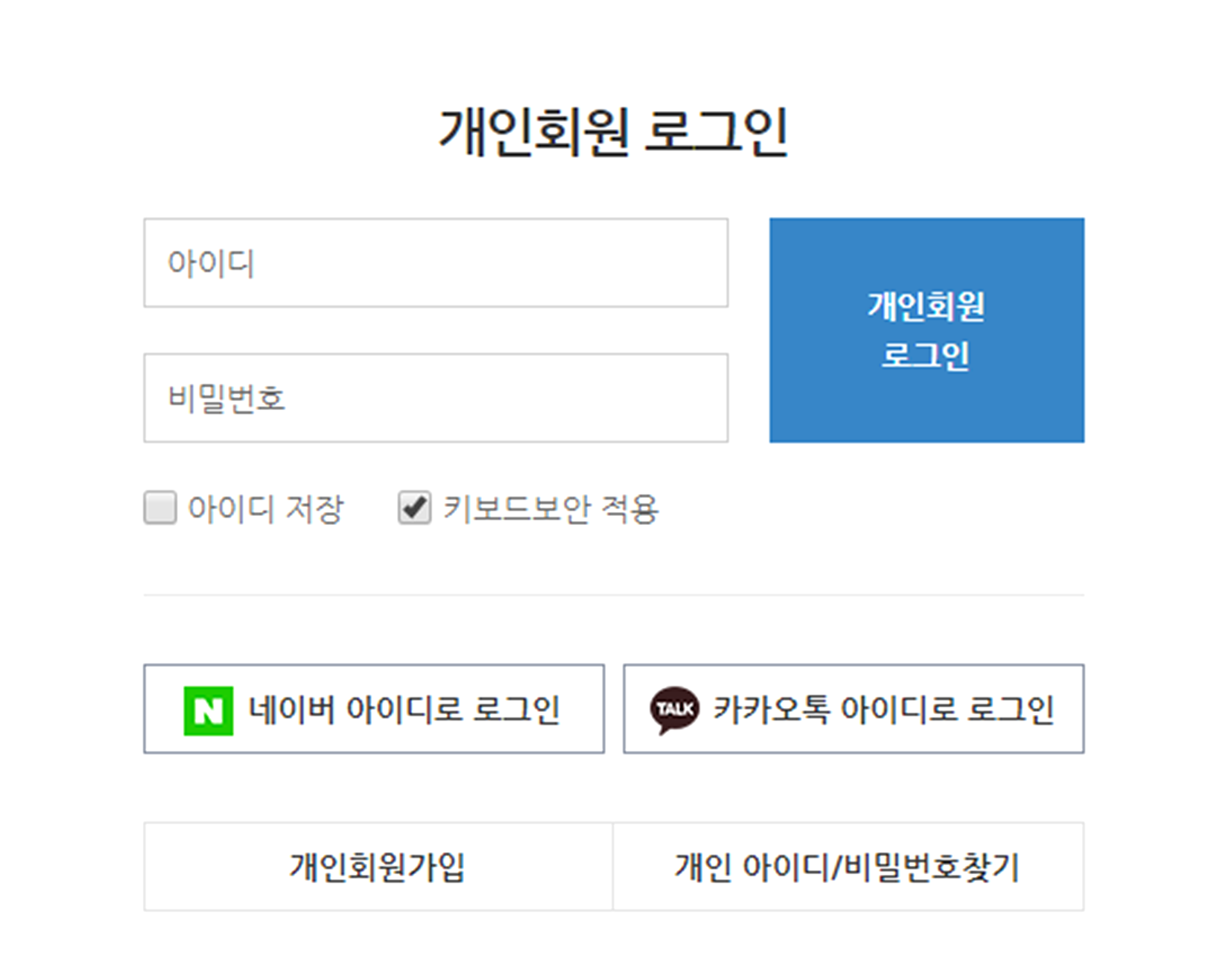 기존에 가입되어 있는 분들은 아이디, 비번 쳐서 로그인을 해주세요.