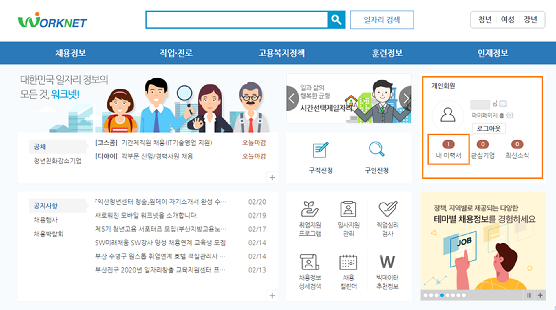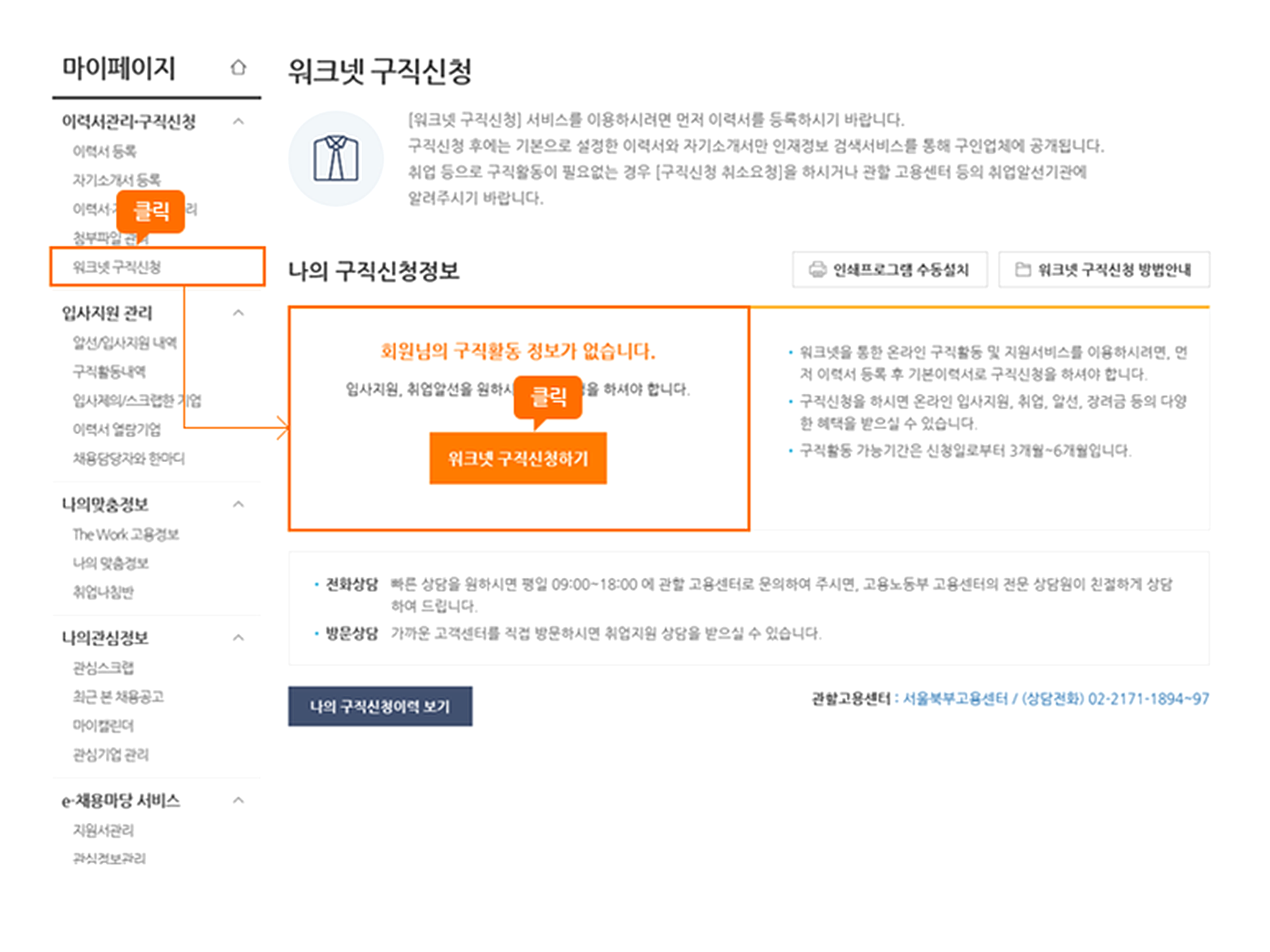 이력서 설정 등록이 끝났다면 마이페이지 - 워크넷 구직신청을 클릭해주세요.