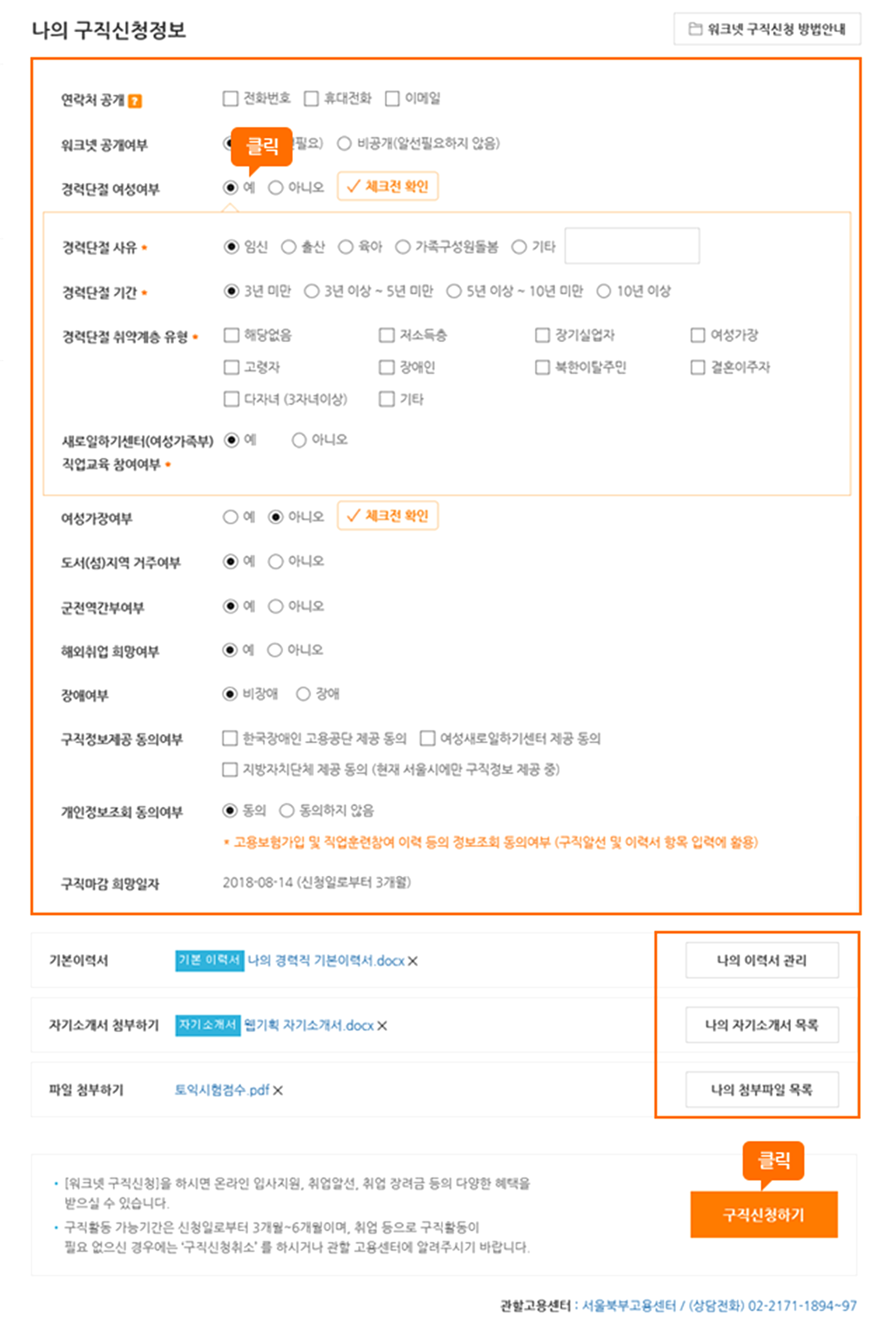 신규건, 기존이건 구직 신청하기를 클릭해주세요.