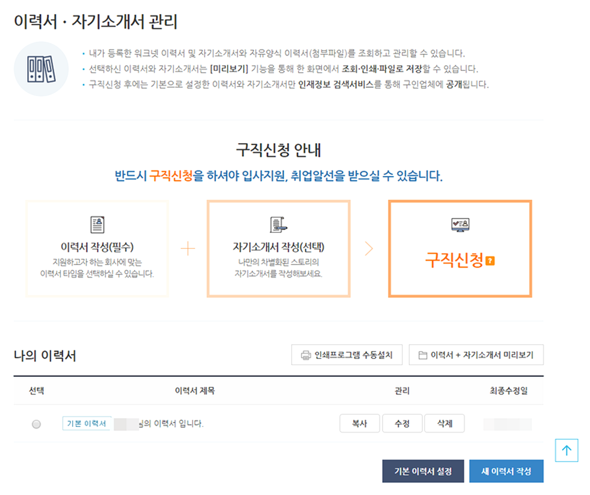 (전 기존에 등록해 놓은 게 있어서 이 방법으로 하지만, 처음이신 분들은 따로 이력서를 등록해 주셔야 해요!