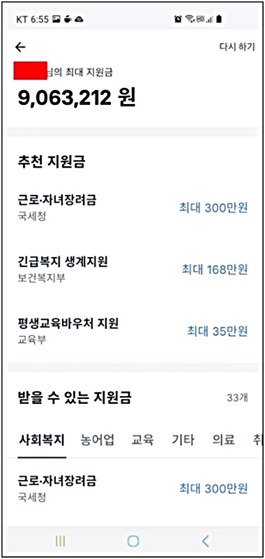 그랬더니 그 소득 범위 내에서 제공받을 수 있는 각종 정부 지원금이 아래와 같이 리스트로 나열되었습니다.