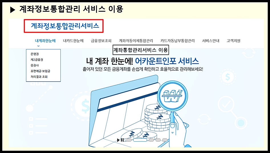 먼저 금융결제원에서 운영하는 '계좌정보통합관리 서비스'를 이용해볼게요.