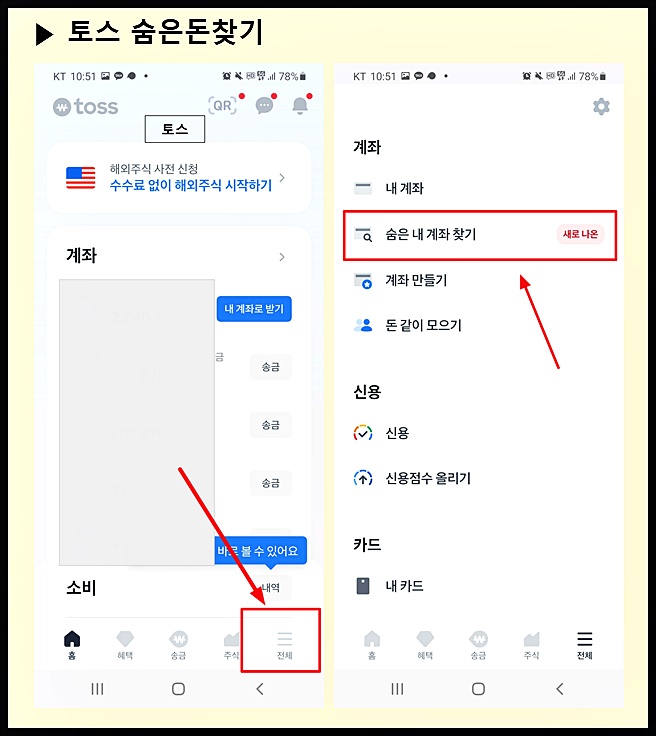 그럼 숨은돈찾기를 위해 전체 메뉴창에서 '숨은 내 계좌 찾기'를 클릭해주세요