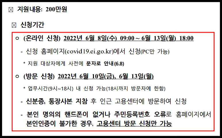 방문신청시에는 통장사본, 신분증을 지참해서 인근 고용센터로 방문해야 해요. 또한 홈페이지에서 본인인증이 불가한 경우에도 방문신청하시면 됩니다.