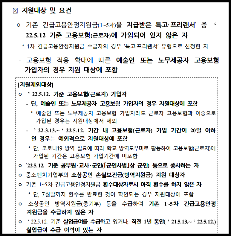 기존에 받은 사람 중 2022년 5월 12일 기준으로 근로자가 아닌 사람(고용보험에 미가입). 예술인과 노무제공자 고용보험 가입자는 지원대상입니다.
