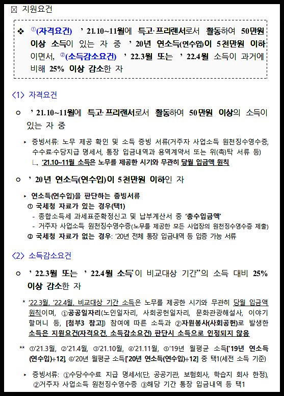 2021년 10월 ~11월에 프리랜서/특고 근로자로 활동해서 50만원 이상 소득이 있는 사람 중 2022년 3월 혹은 4월 소득이 과거에 비해 25%이상 감소되었어야 합니다 .