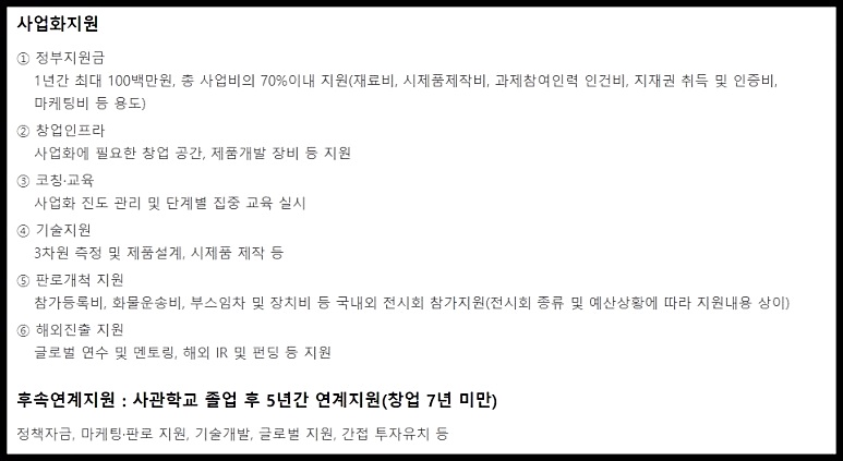 후속연계지원으로 사관학교 졸업 후 5년간 정책자금 등을 연계지원하고 있어요.