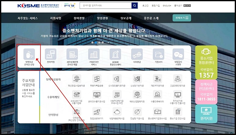 중소벤처기업부 사이트 메인에 들어가면 정책자금 온라인 신청 버튼을 확인할 수 있어요.