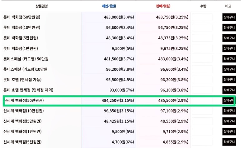 신세계상품권 50만원어치를 484,250원에 구입이 가능하므로 약 3.15%를 할인받는 셈이네요. ​
