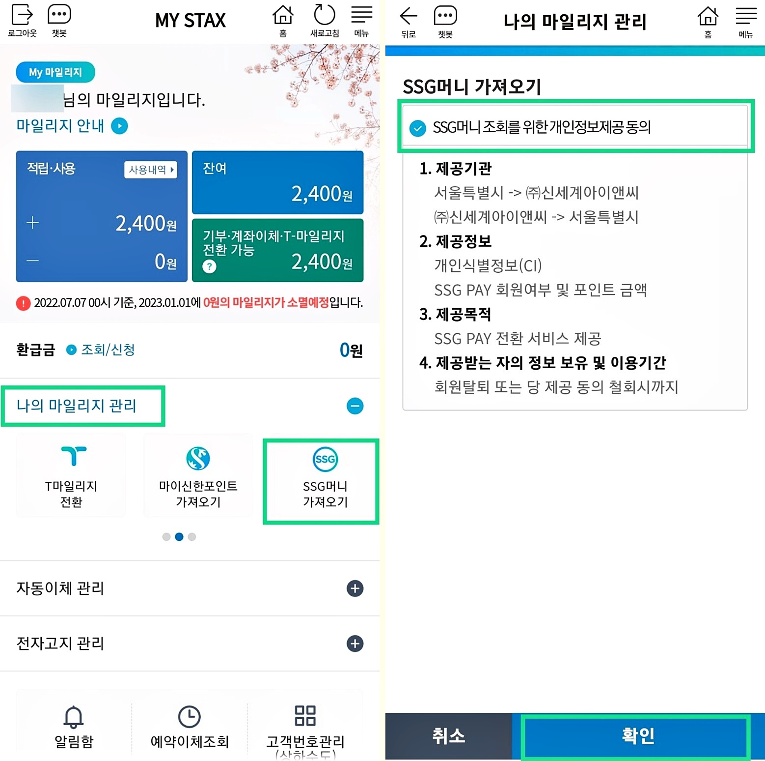 로그인 후 MY STAX로 들어오면 중간쯤 나의 마일리지 관리 -  SSG 머니 가져오기 버튼이 보여요.