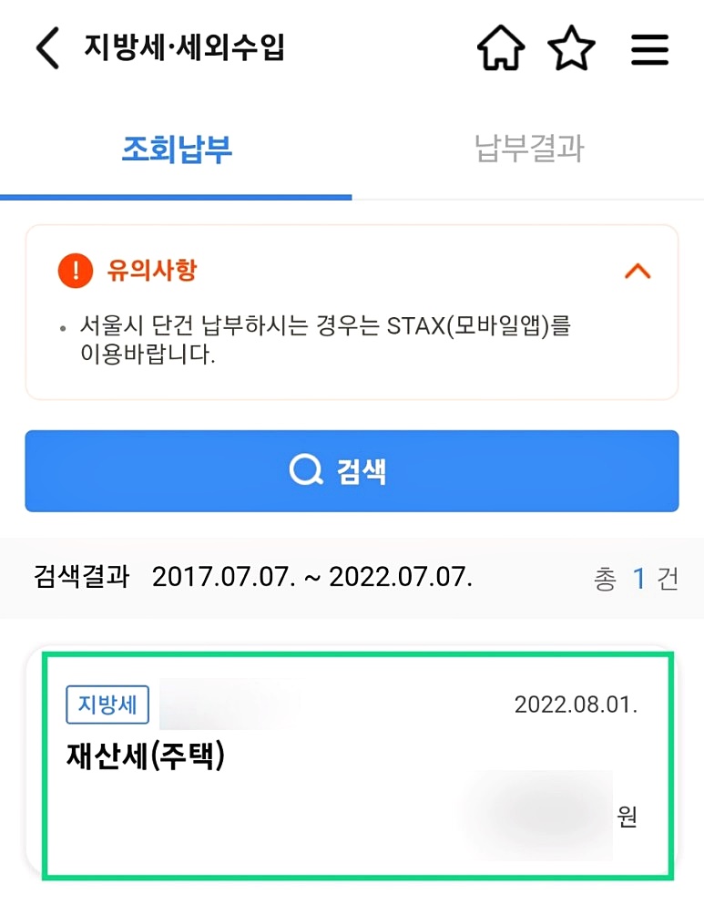 다만 서울시 단건으로 재산세 납부를 원하시면 위택스가 아닌 스택스(STAX)로 들어가 납부하셔야 해요.