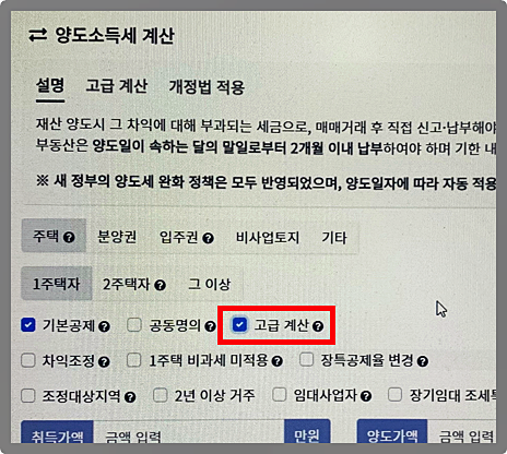 예를 들어 차익을 조정해야 하는 상황, 1주택 비과세 미적용, 다주택 중과 미적용, 장기보유특별공제 등이 필요한 경우 '고급 계산'을 눌러 해당하는 항목을 선택해서 계산을 진행하면 보다 정확한 세금을 계산할 수 있죠!