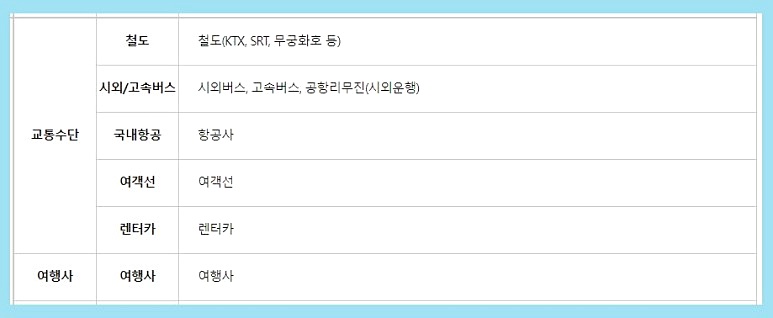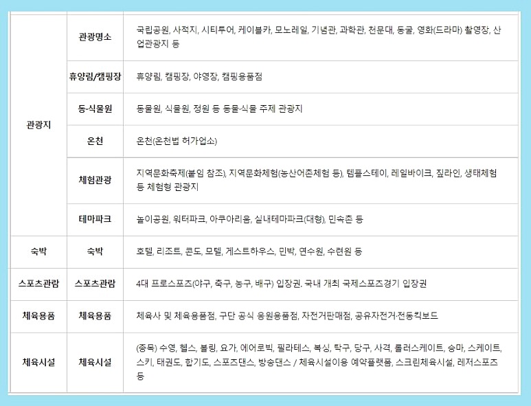 도서, 음악, 영상, 공연, 미술, 문화체험, 교통수단(철도,시외 및 고속버스, 항공, 여객선, 렌터카), 여행사, 온천 등