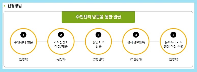 1. 주민센터 -> 카드신청서 작성/제출 -> 자격검증 -> 정보등록 -> 카드수령