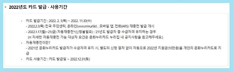 여기서 자동재충전이란, 21년도 카드발급자가 자격을 유지할 시 별도의 신청 없이 자동으로 22년도 지원금이 문화누리카드로 지급되는 것을 말해요.