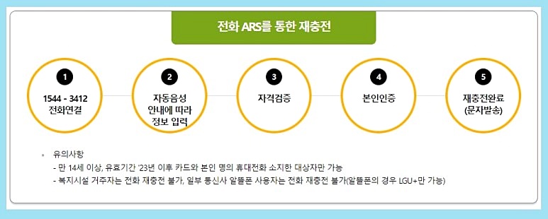 3. 전화연결 -> 자동 음성 안내 -> 자격 검증 절차 -> 본인 확인 -> 재충전 완료