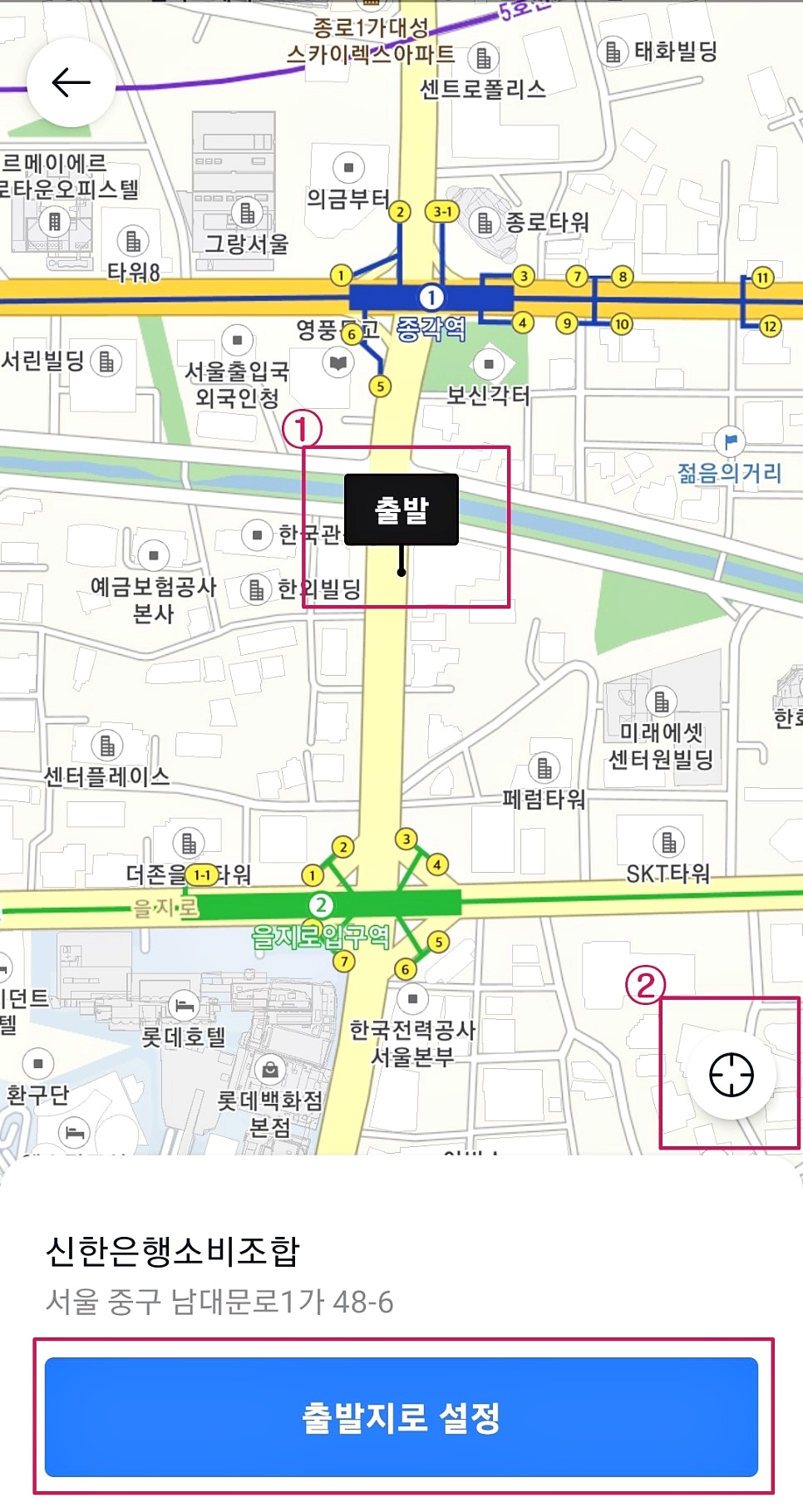 ① 원하시는 출발 지점을 지도를 움직이면서 설정하거나