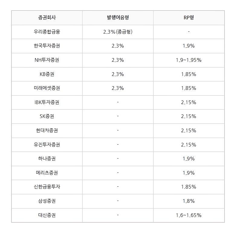 MMF형이나 MMW형은 수익률이 사전에 확정되어 있는 것이 아니라 펀드처럼 실적배당되는 상품이라 수익률 비교가 불가능해, 발행어음형과 RP형 CMA 금리만 비교해보도록 할게요.