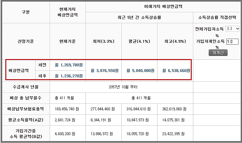 현재까지 제가 납부한 기준으로 보면 예상 연금 수령액은 세후 월 120만 원 정도네요.