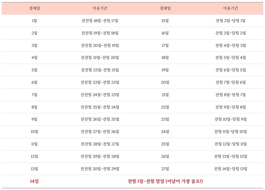 개인적으로 결제일을 1일부터 13일 사이로 설정하는 건 추천드리지 않는데요.