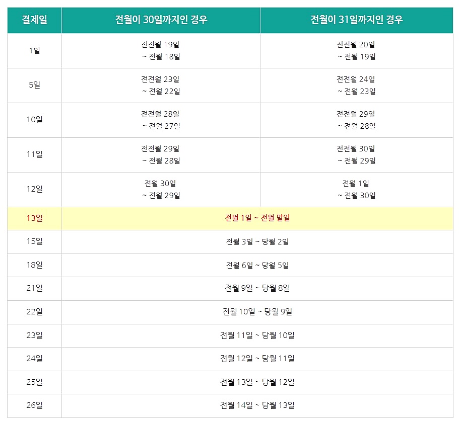 위 표에서 보시면 13일을 결제일로 설정할 경우, 이용기간이 전월 1일 ~ 전월 말일까지로 이용대금 파악이나 사용내역을 정리하기가 가장 수월하기 때문이에요!