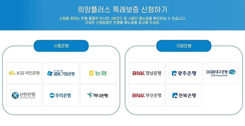 소상공인 희망플러스 특례보증은 시중은행 6곳과 지방은행 5곳에서 신청할 수 있는데요.