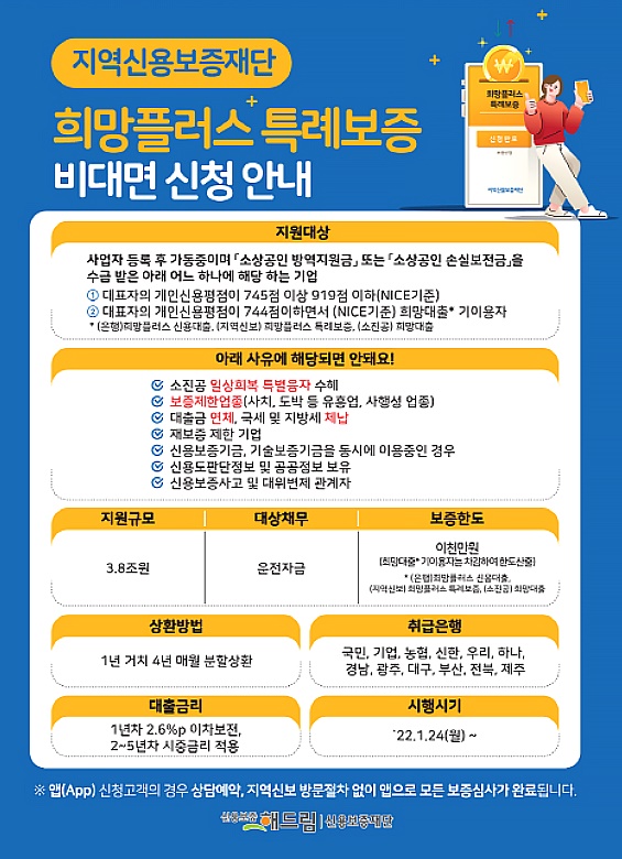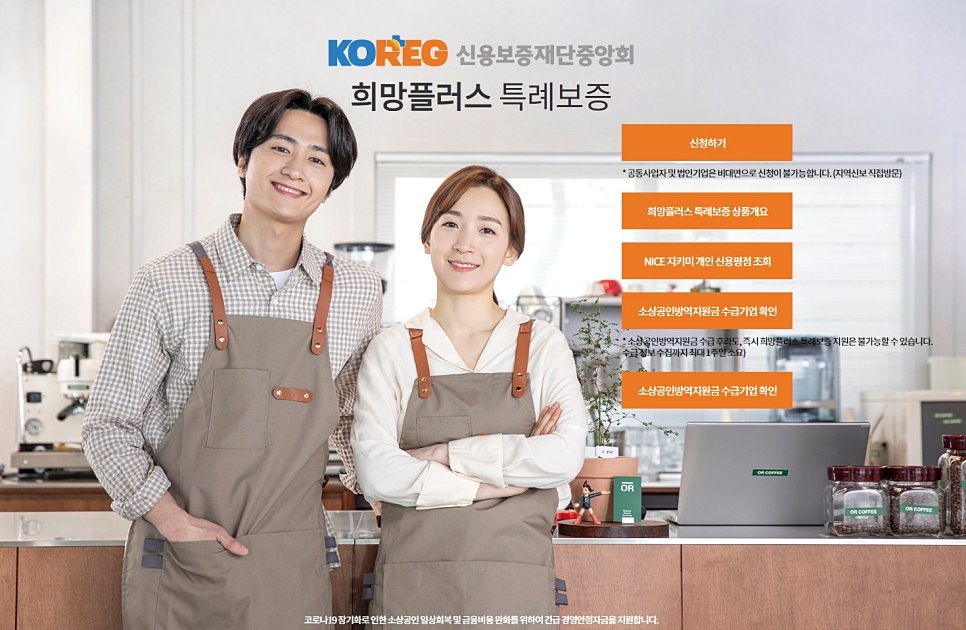 단 모든 개인 대상은 아니고 소상공인, 즉 자영업자 대상으로 소상공인 희망플러스 특례보증 상품이 출시되었어요.