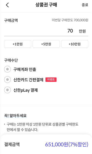 1회 최소 구매금액은 1만 원, 최대 70만 원까지 구매 가능하고 구매금액 10만 원 입력 시 93,000원이 결제돼요.