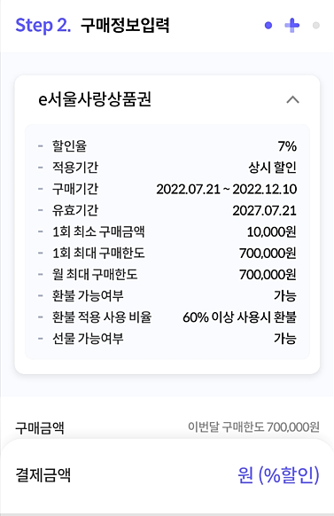 또 온라인 서울사랑상품권 구매 시 할인율 7%가 적용되며 할인 구매한도는 70만 원까지에요.