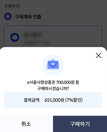 구매 계좌를 통해 결제하면 서울사랑상품권 구매가 완료돼요.