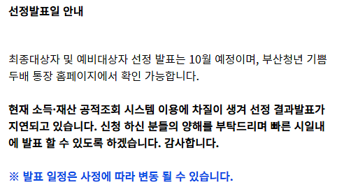 그래서 부산청년 기쁨두배통장 결과 및 선정자 발표는 10월로 연기되었으며, 발표 일자는 추후 재공지 예정으로 해당 홈페이지에서 확인 가능해요.